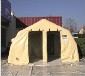 Se pueden hacer a medidas y estudiar para diferentes configuraciones de uso: Descontaminación, Campo militar, Campo de obra, Confinamiento. Nuestro último modelo no tiene armadura metálica: se acciona el inflador de aire y la carpa se pone en forma en unos minutos con poco personal.